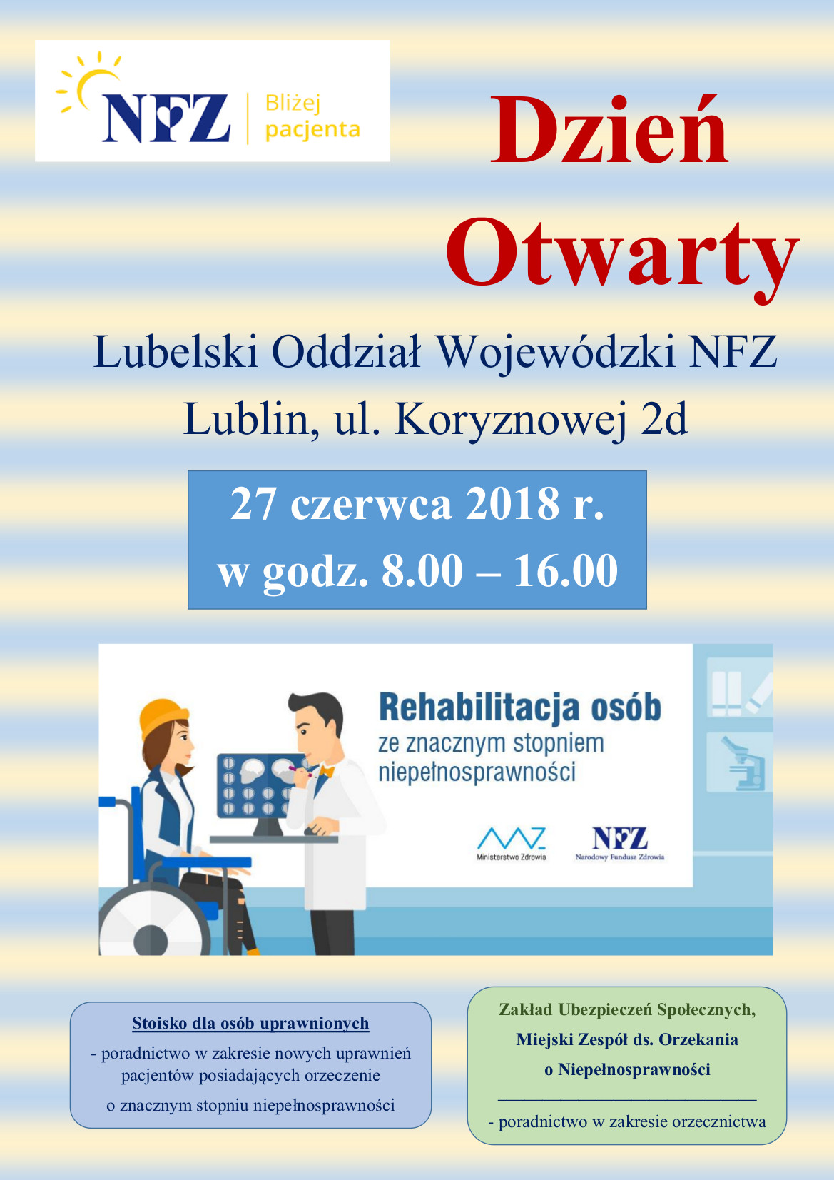 27 czerwca 2018 r. w godz. od 8.00 do 16.00, Lubelski Oddział Wojewódzki Narodowego Funduszu Zdrowia organizuje Dzień Otwarty pod hasłem: „NFZ bliżej pacjenta”.