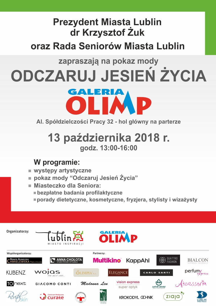Lubelski Oddział Wojewódzki NFZ serdecznie zaprasza na swoje stoisko podczas akcji prozdrowotnej „Odczaruj jesień życia”, organizowanej przez Urząd Miasta Lublin oraz Radę Seniorów w Galerii Olimp w Lublinie.