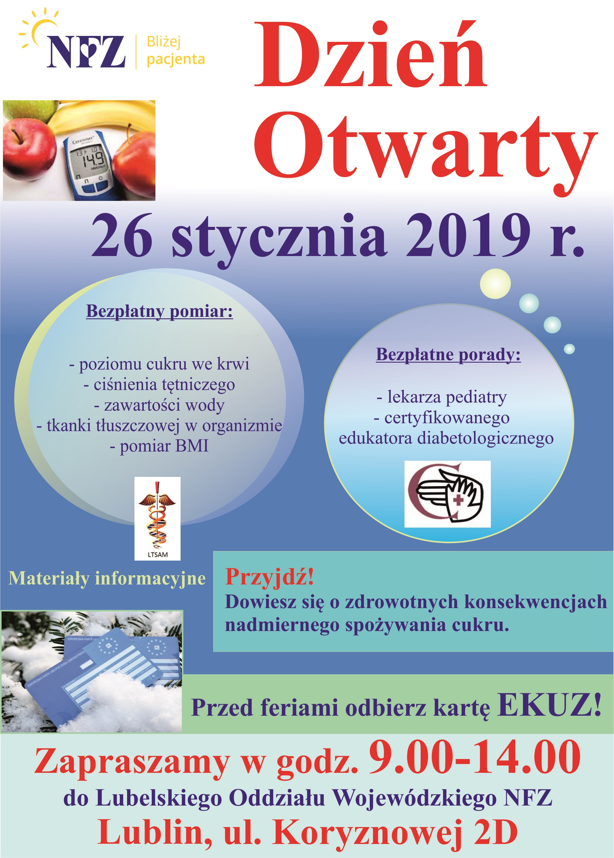 26 stycznia 2019 r. w godz. od 9.00 do 14.00, Lubelski Oddział Wojewódzki Narodowego Funduszu Zdrowia organizuje Dzień Otwarty pod hasłem: „#NieCukrz - cukier szkodzi”.