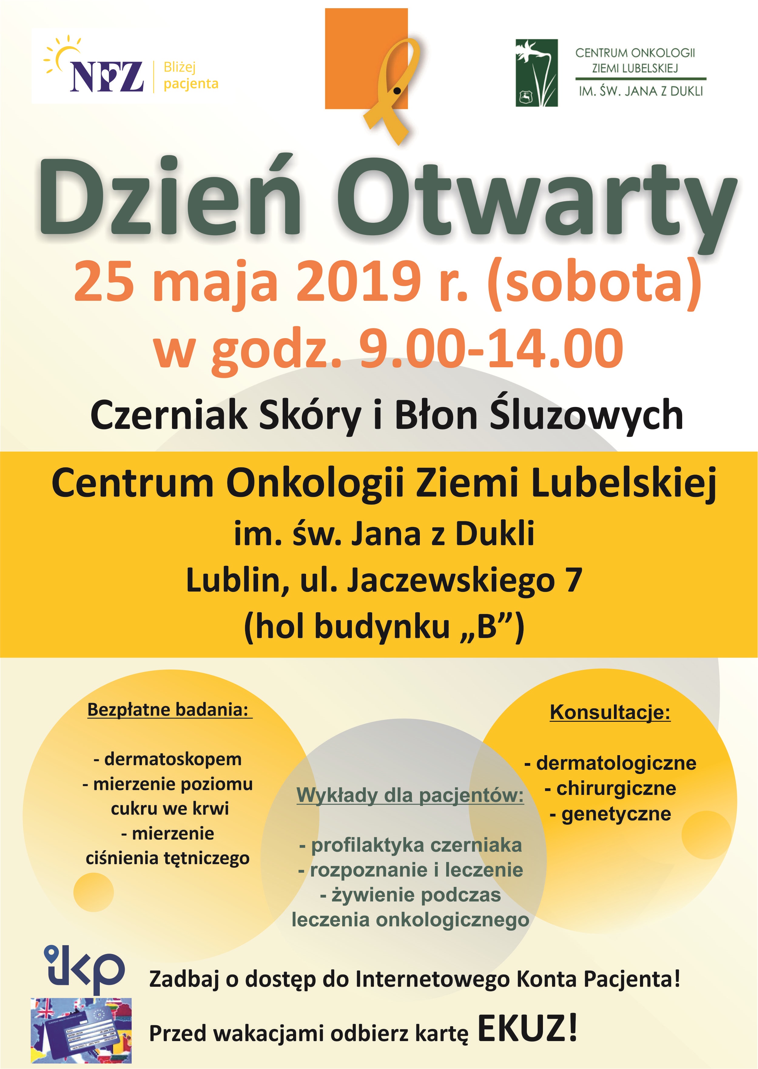 25 maja 2019 r. Lubelski Oddział Wojewódzki Narodowego Funduszu Zdrowia we współpracy z Centrum Onkologii Ziemi Lubelskiej im. św. Jana z Dukli organizuje akcję prozdrowotną pod hasłem: „Dzień Otwarty”. Tematem przewodnim wydarzenia jest Profilaktyka czerniaka i innych nowotworów skóry.
