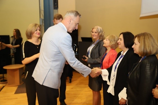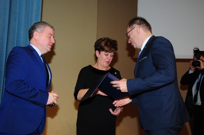Andrzej Tytuła Przewodniczący Okręgowej Izby Pielęgniarek i Położnych w Lublinie wręczył na ręce dyrektora Tarkowskiego pamiątkowy grawerton z gratulacjami z okazji Jubileuszu XX-lecia PUZ w Polsce.