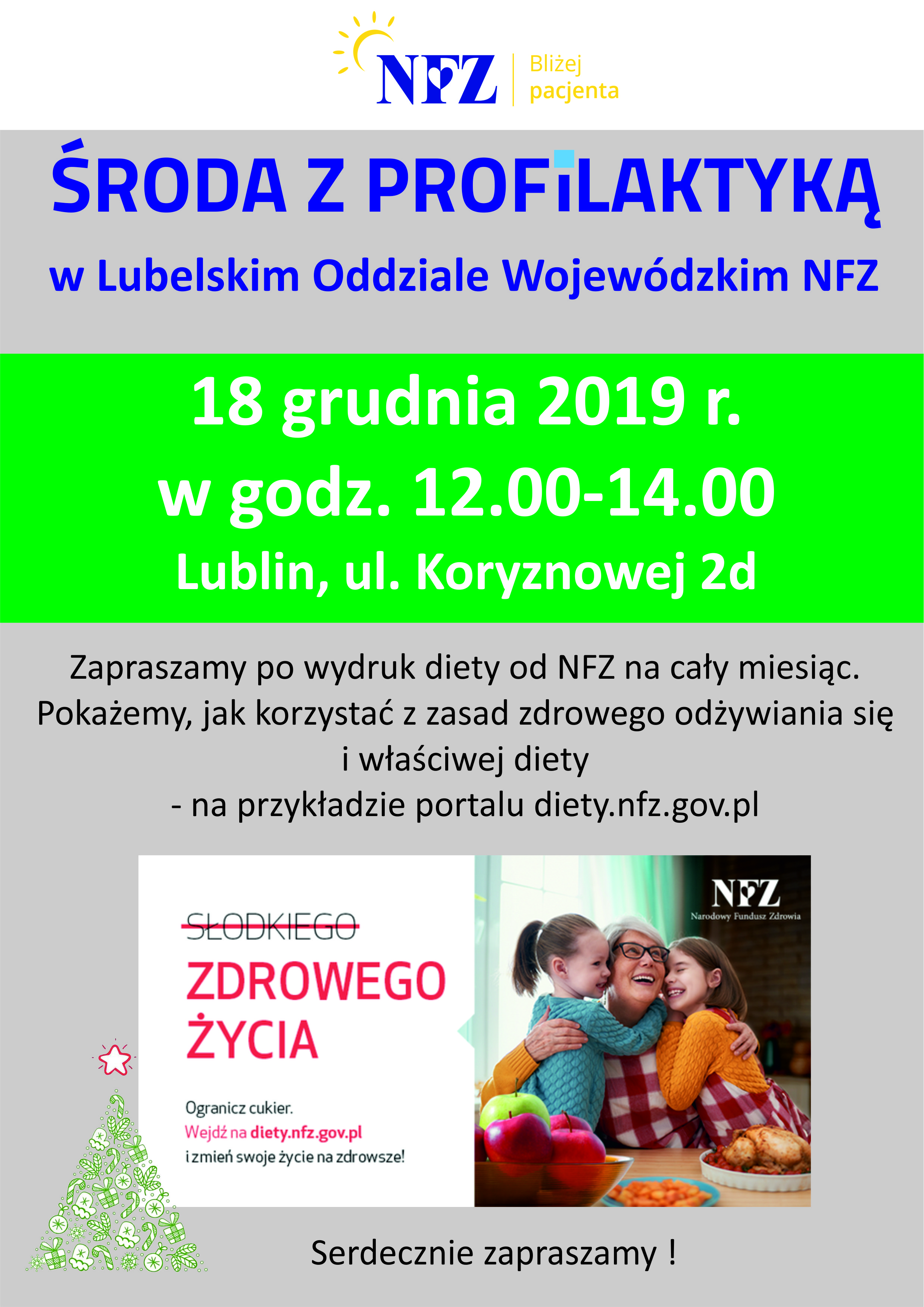 Szanowni Państwo, 18 grudnia 2019 r. Lubelski Oddział Wojewódzki Narodowego Funduszu Zdrowia zaprasza na „Środę z profilaktyką”.