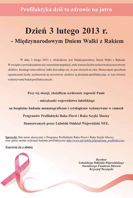 Dzień 3 lutego 2013 r. - Międzynarodowym Dniem Walki z Rakiem