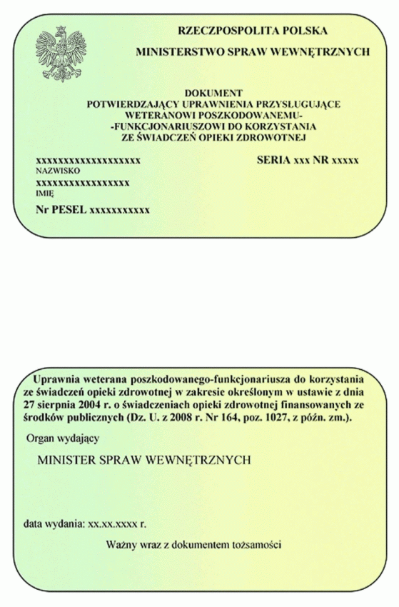 Dokument potwierdzający uprawnienia przysługujące weteranowi poszkodowanemu-funkcjonariuszowi do korzystania ze świadczeń opieki zdrowotnej.