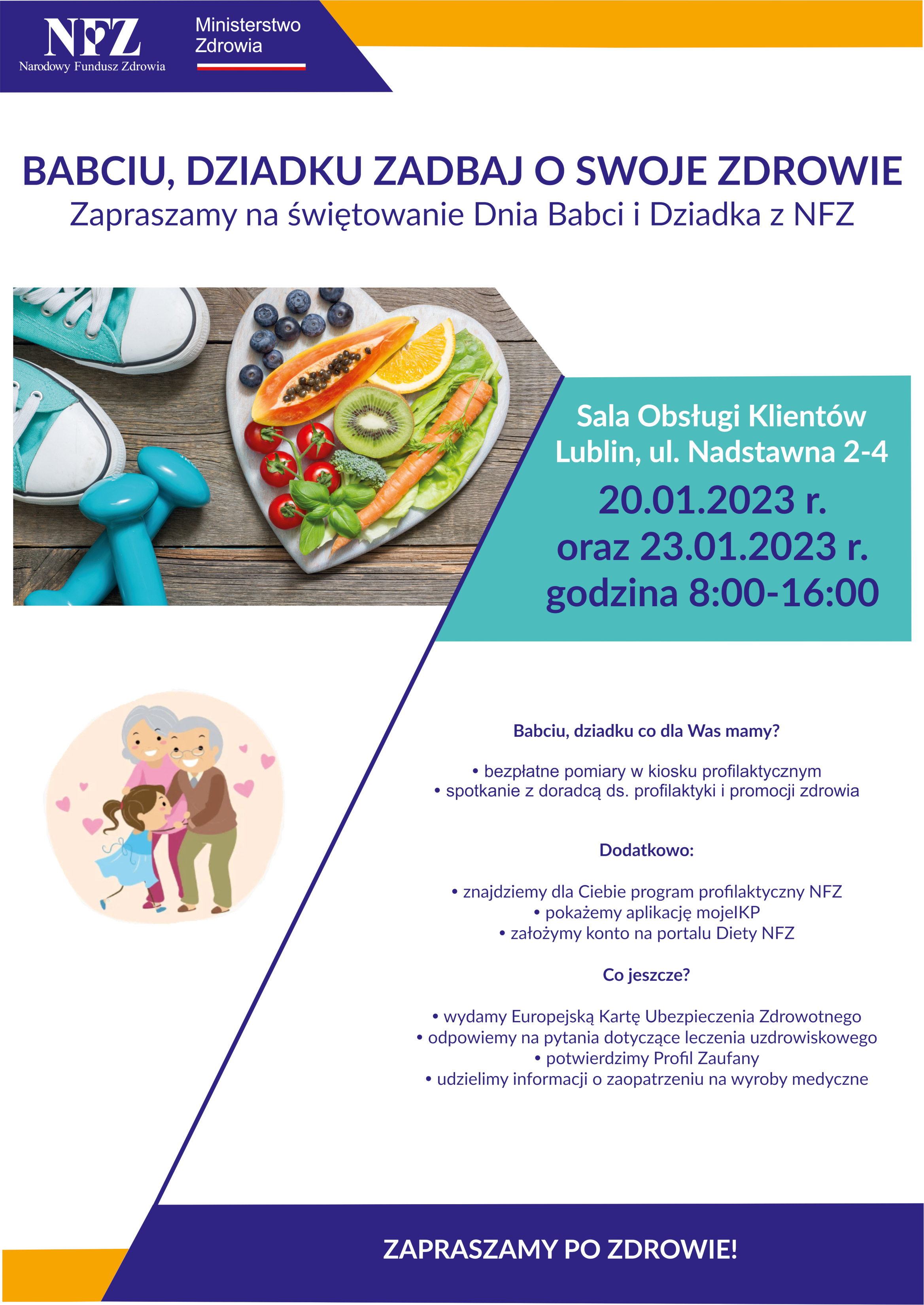 W piątek, 20 stycznia oraz w poniedziałek, 23 stycznia 2023 r. zapraszamy na świętowanie Dnia Babci i Dziadka z NFZ.